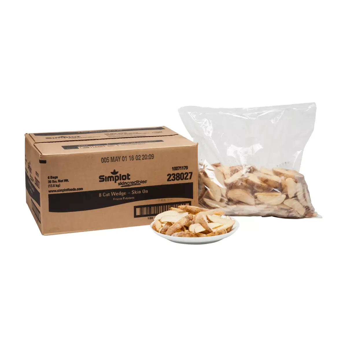 The ultimate in pure potato taste and homemade, skin-on appearance, Skincredibles® offers a variety of options and cuts, from fries and wedges to chips and boats, all with satisfying potato flavor. This 8-cut, skin-on wedge stays warm and crisp in the cafeteria or the deli case.