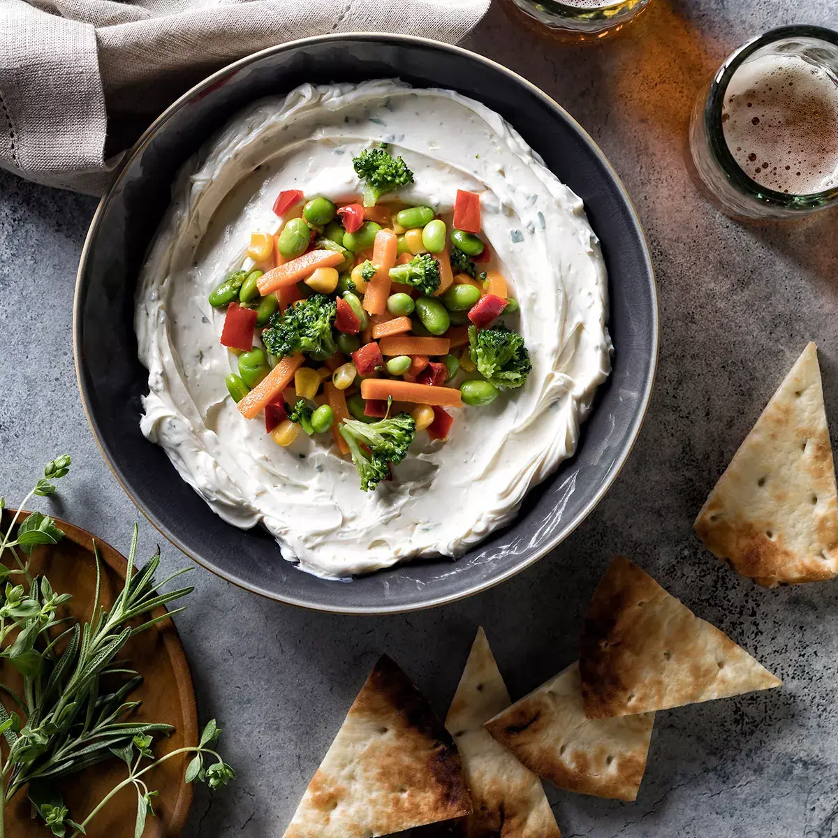 - Farm-fresh edamame, broccoli, carrots, corn, red bell pepper