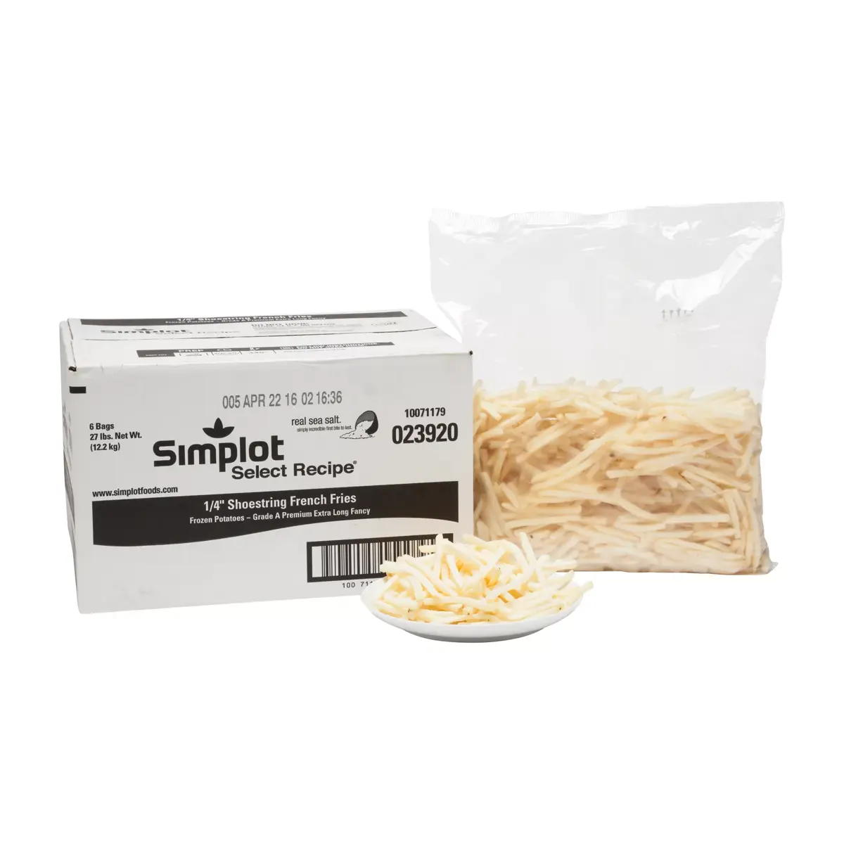 With consistent seasoning and enhanced hold time, Simplot Select Recipe® fries feature a chef-crafted recipe with real sea salt to deliver outstanding flavor. Their hand-cut appearance and great length give these fries great presentation and profitability. This 1/4" shoestring cooks up extra crispy and fast.